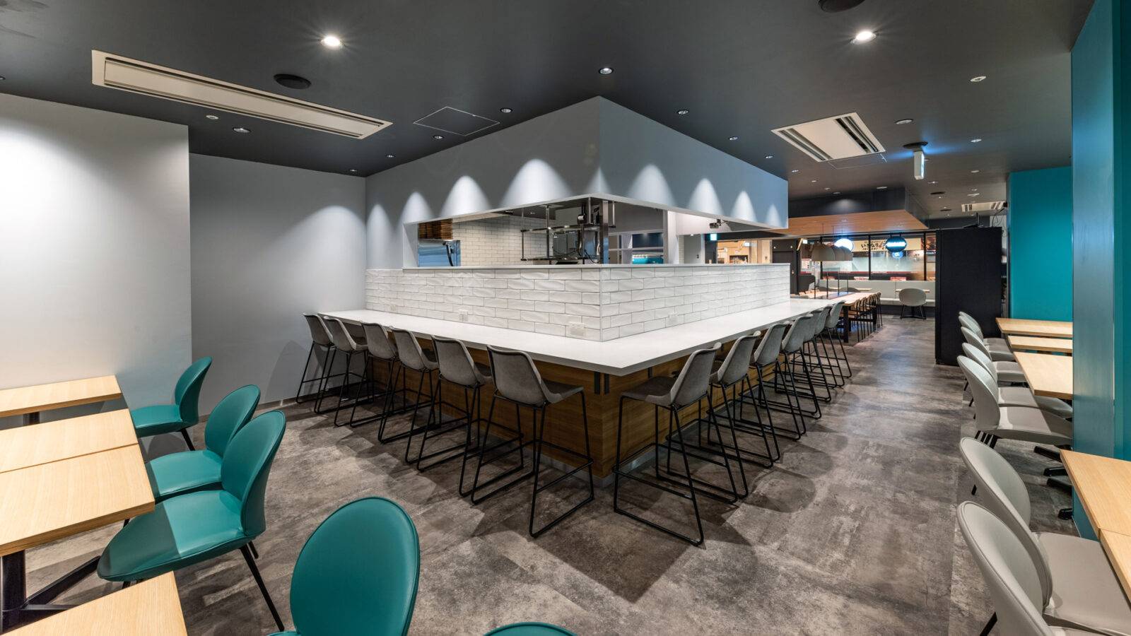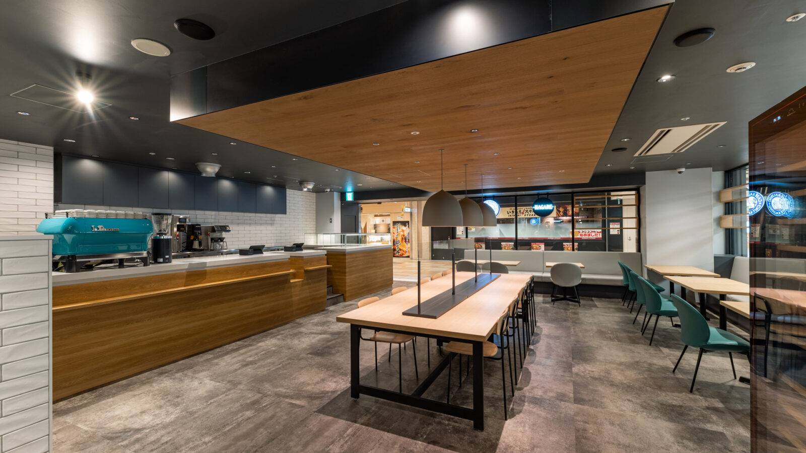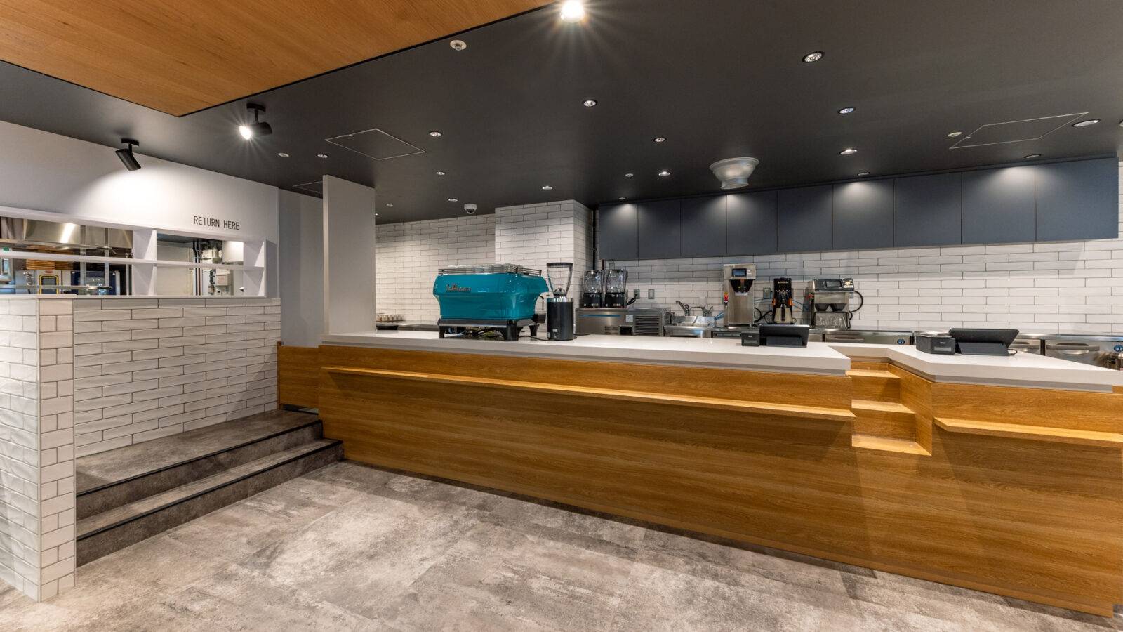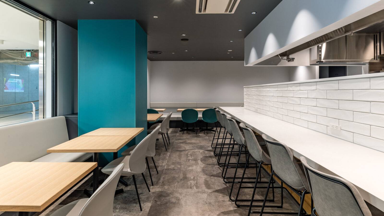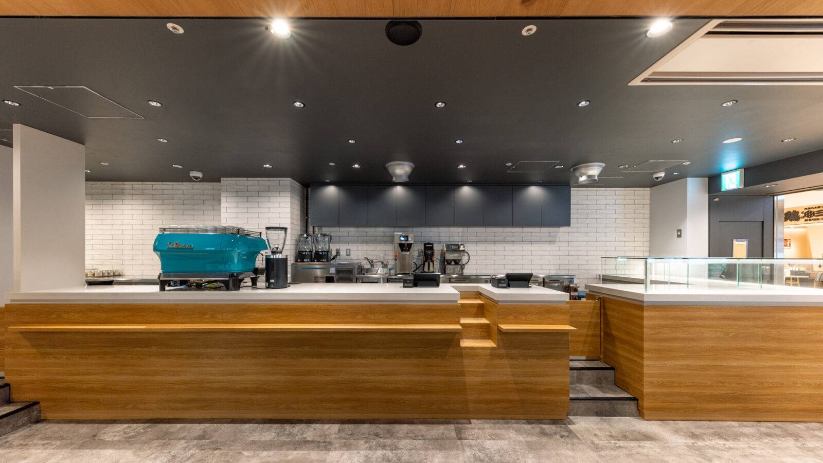 八重洲の地下飲食店街にベーカリーカフェ&ワインバーをデザイン。鮮やかなコーヒーマシンのカラーを空間にも落とし込んだ。