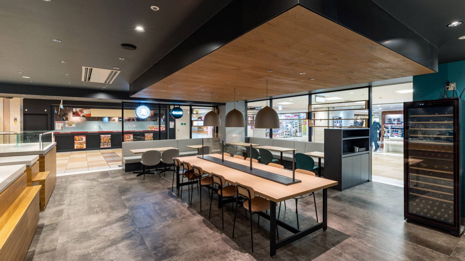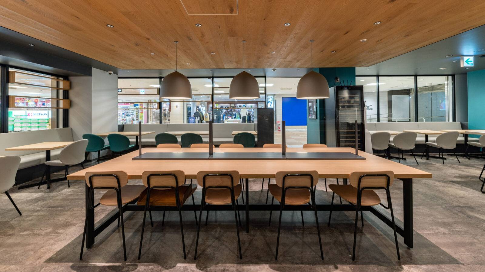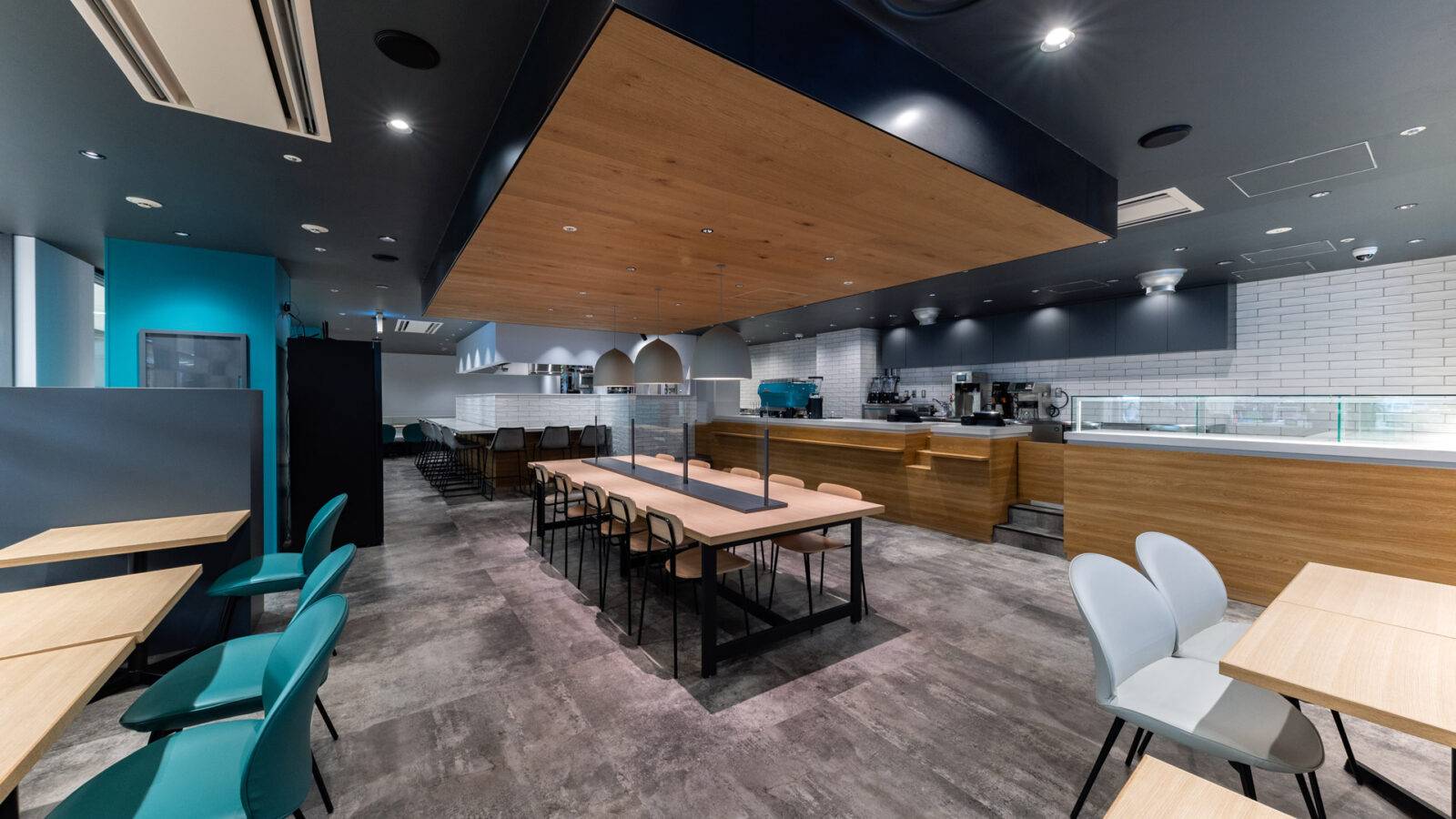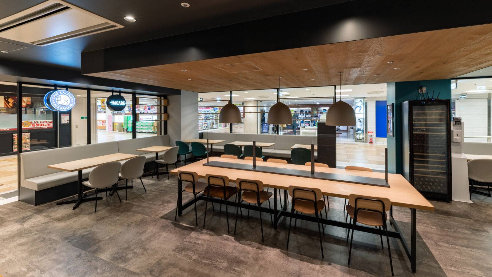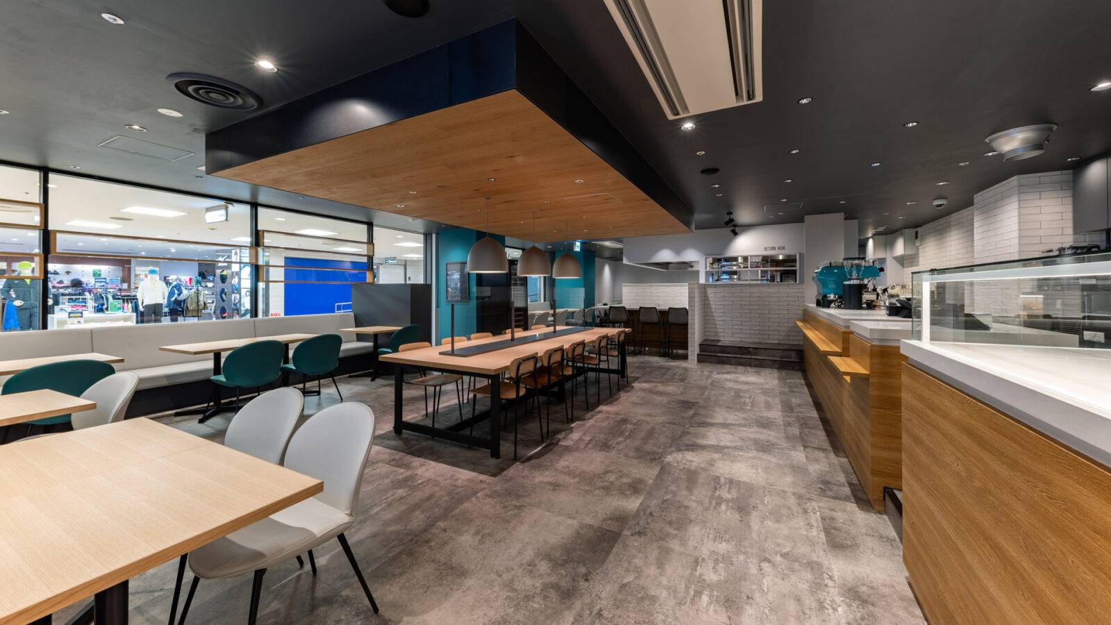 八重洲の地下飲食店街にベーカリーカフェ&ワインバーをデザイン。鮮やかなコーヒーマシンのカラーを空間にも落とし込んだ。