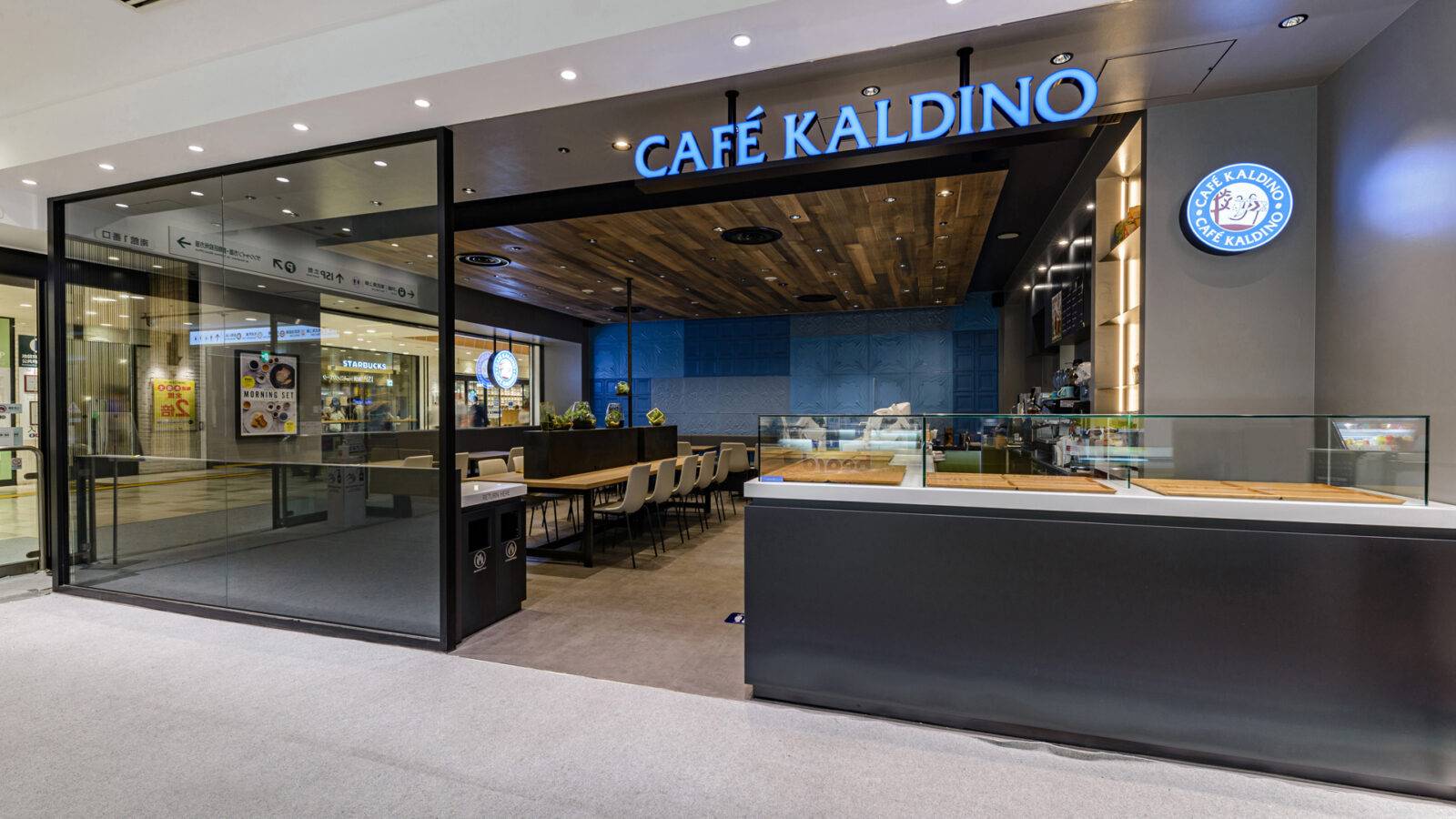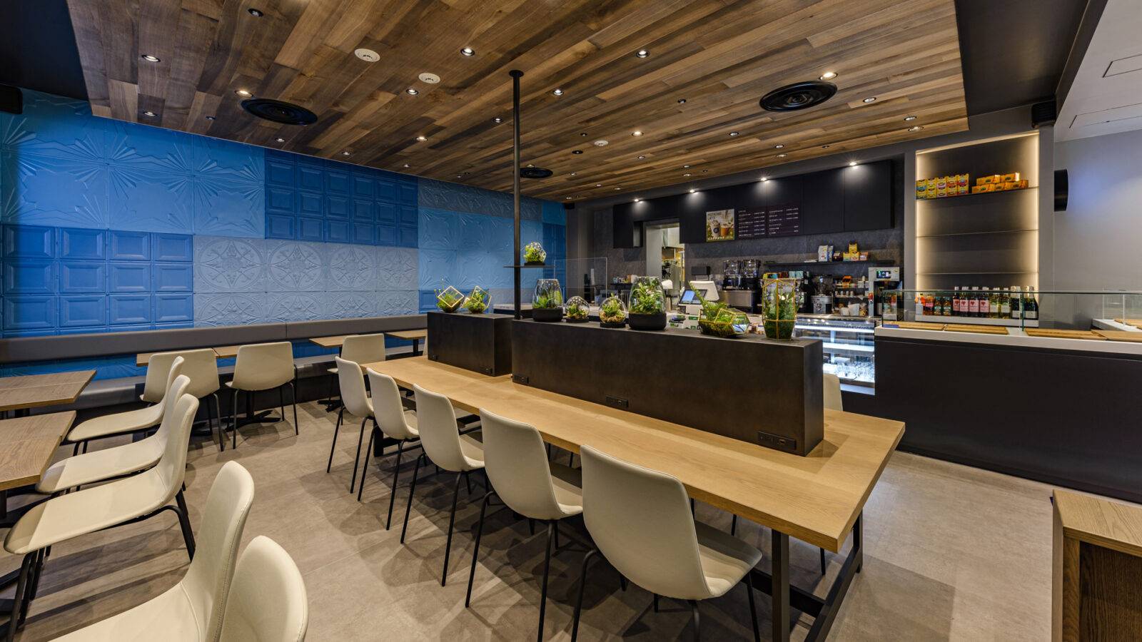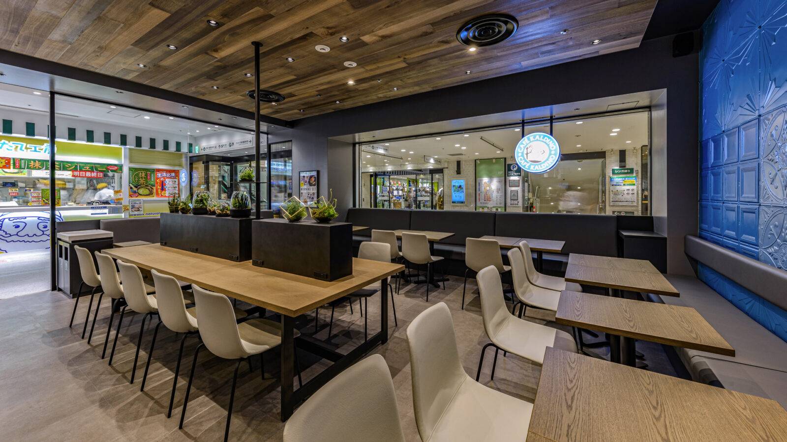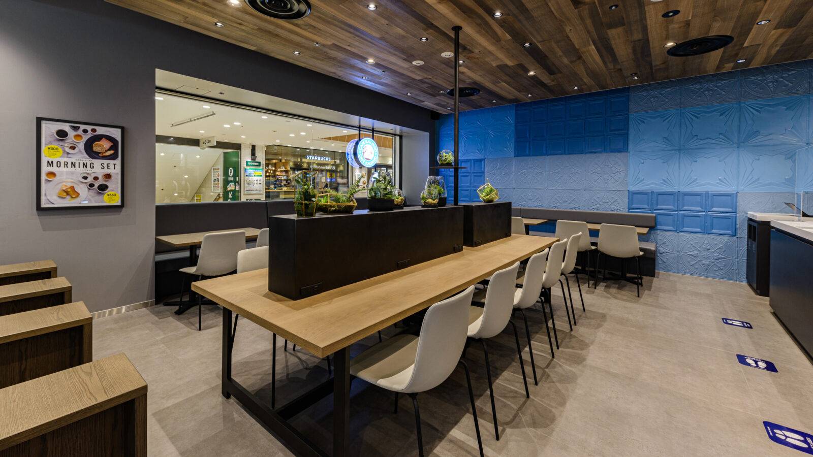 通行量の多いショッピングセンターにカフェをデザイン。店舗のイメージカーラに塗装したティンタイルが主役。